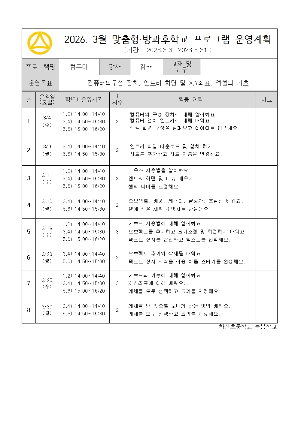 2026학년도 맞춤형 방과후학교 프로그램 3월 계획서(컴퓨터)