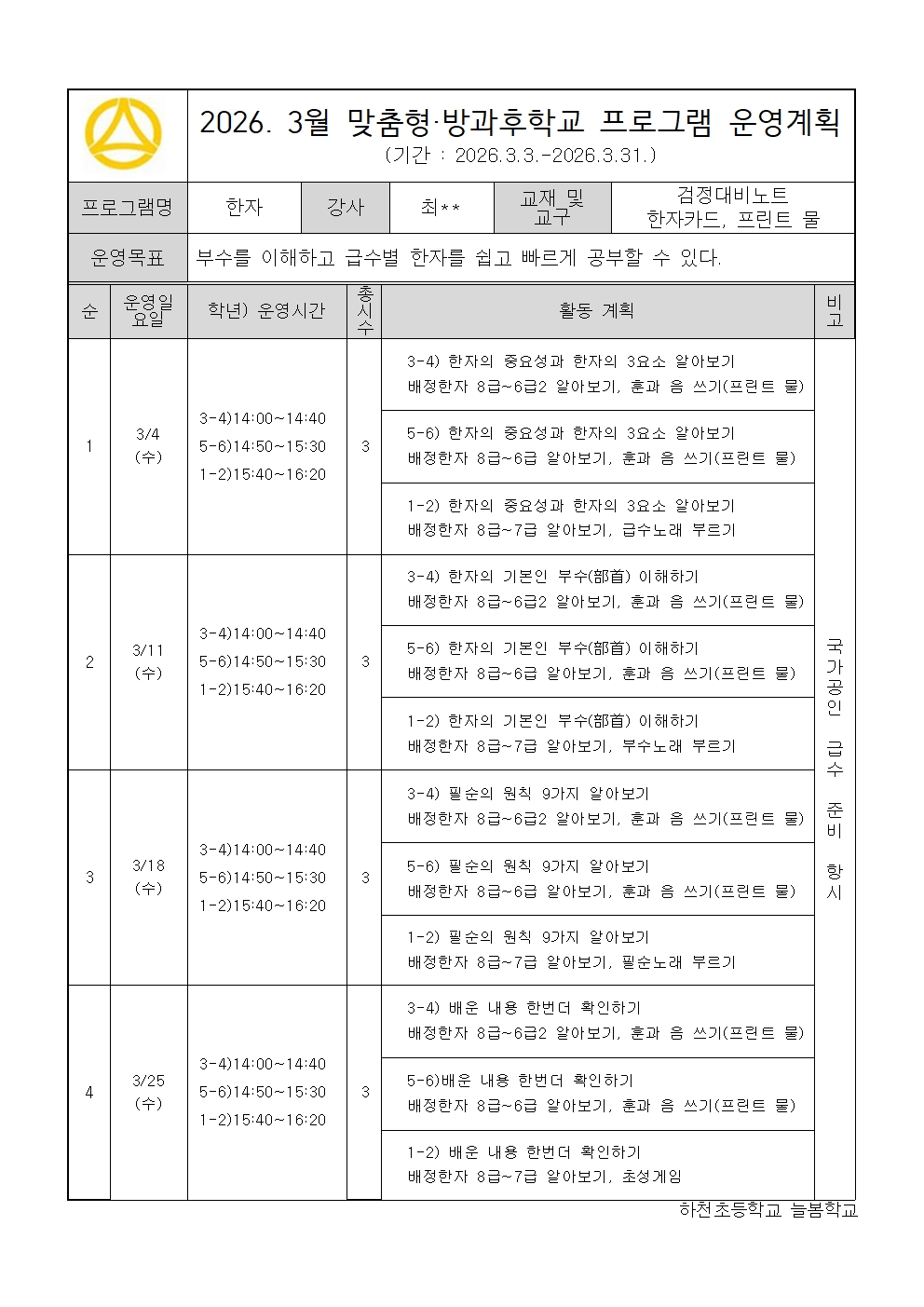 2026학년도 맞춤형 방과후학교 프로그램 3월 계획서(한자)
