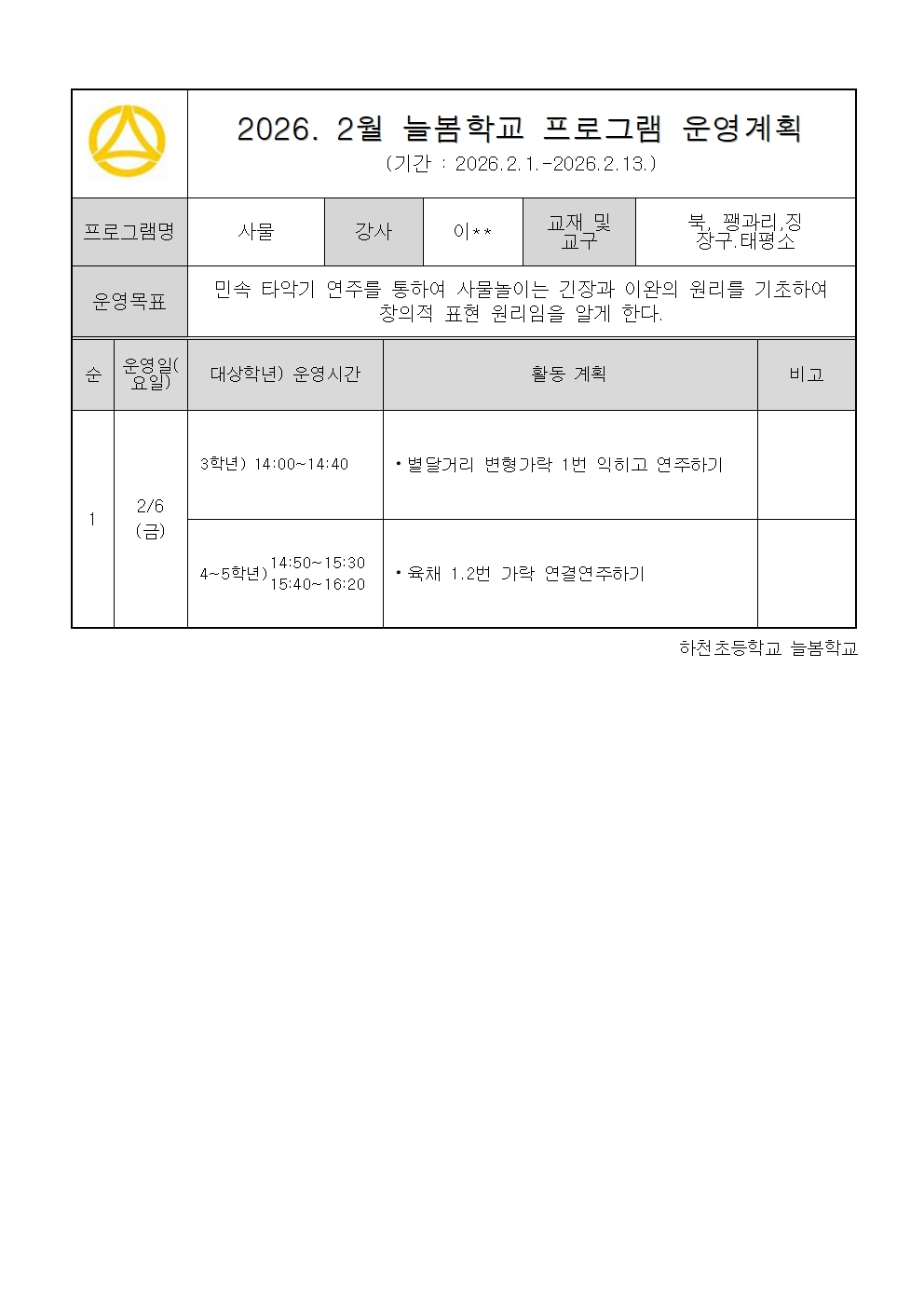 * 해당 게시물은 '돌봄·방과후학교 > 맞춤형•방과후학교 > 월별운영계획서' 게시판에서 이동되었습니다.