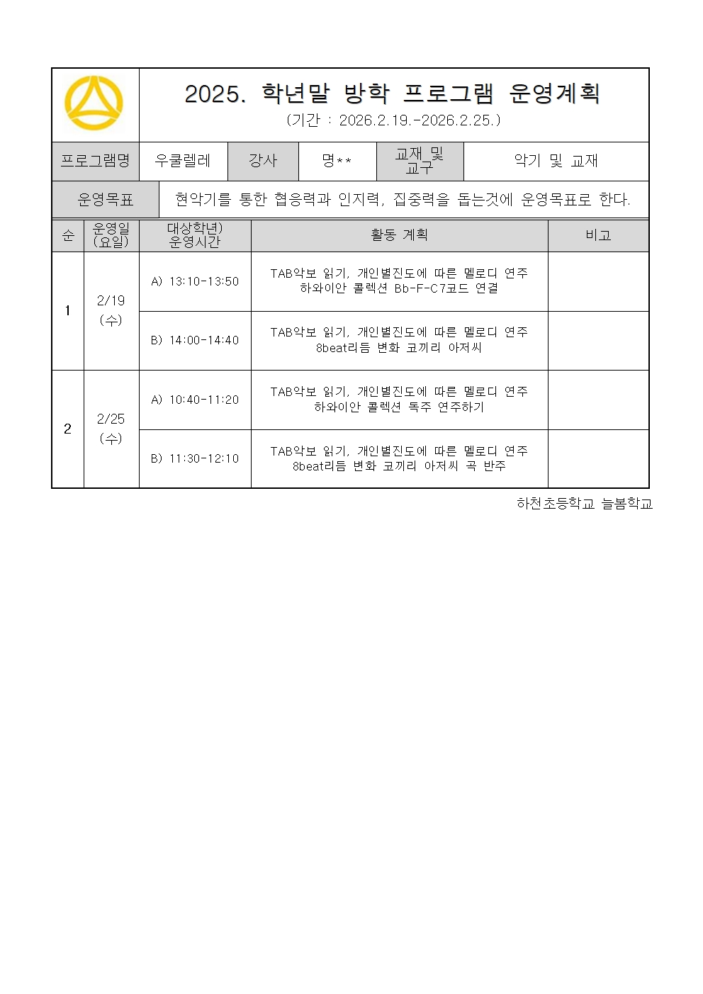 2025. 2월 학년말방학 운영 계획 - 우쿨렐레