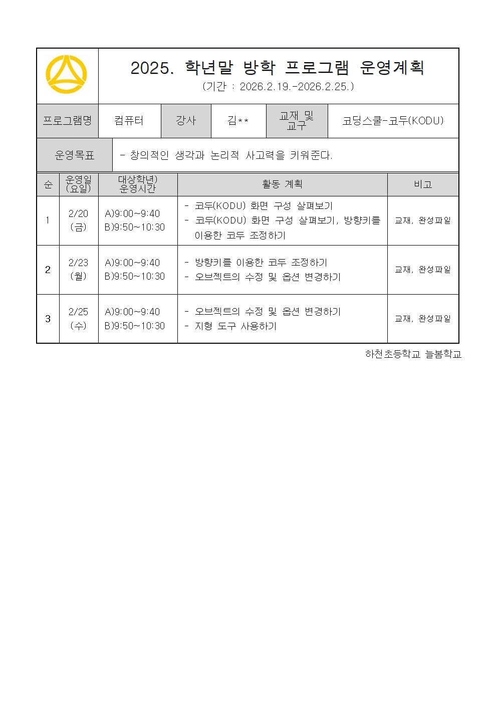 2025. 2월 학년말방학 운영 계획 - 컴퓨터