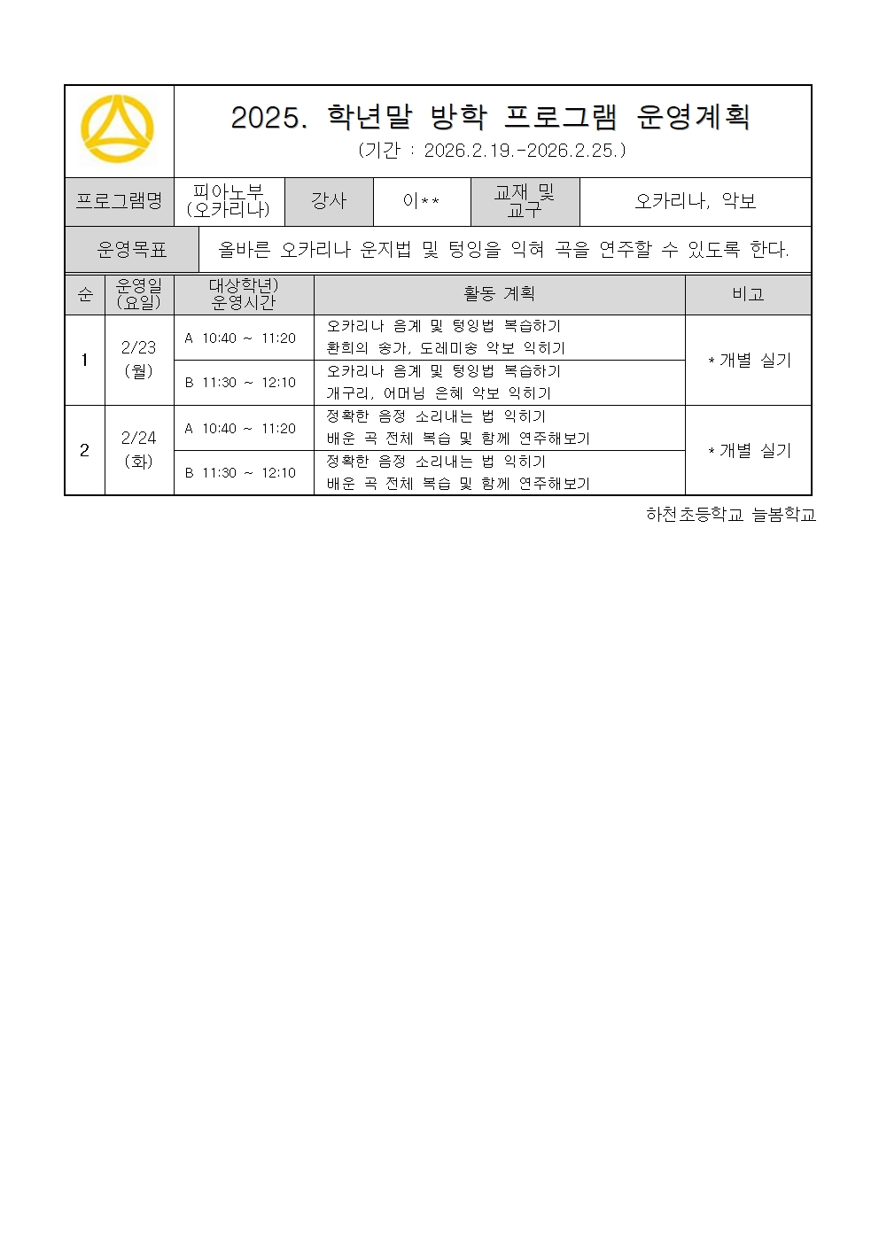 2025. 2월 학년말방학 운영 계획 - 피아노