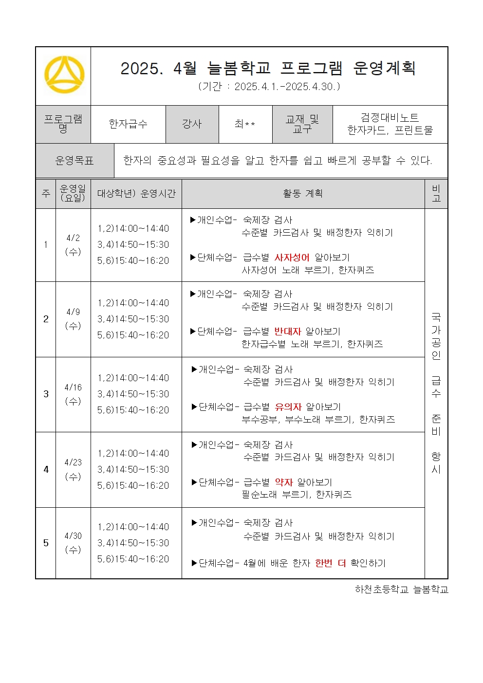 2025. 4월 운영계획 - 한자(급수)