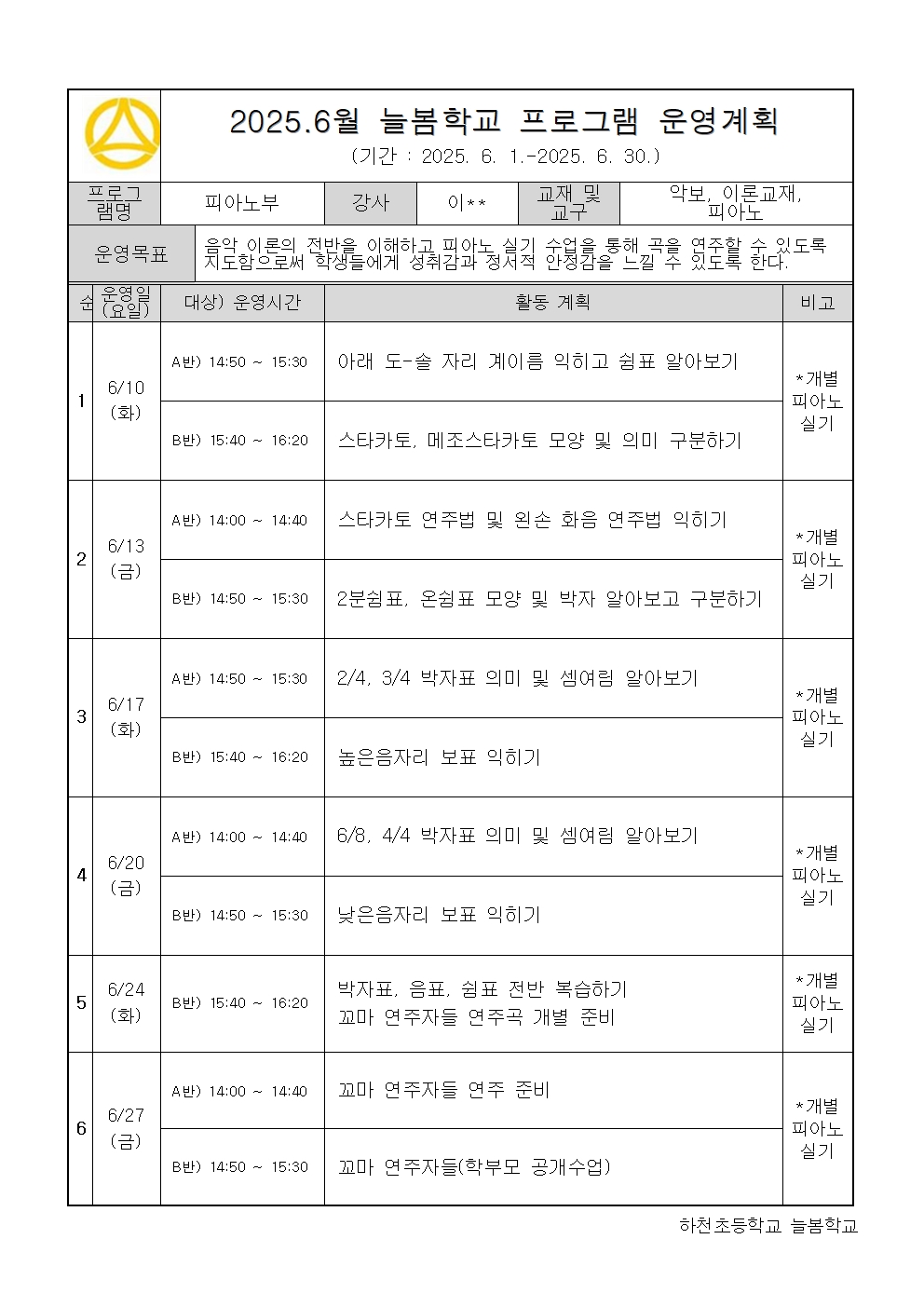 2025. 6월 운영계획 - 피아노