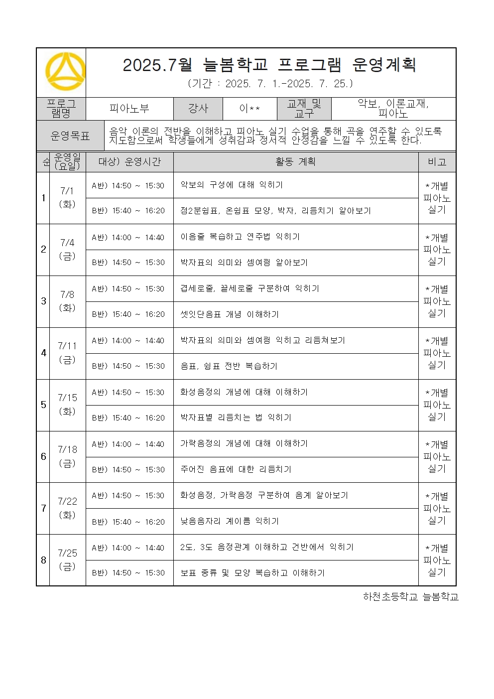 2025. 7월 운영계획 - 피아노