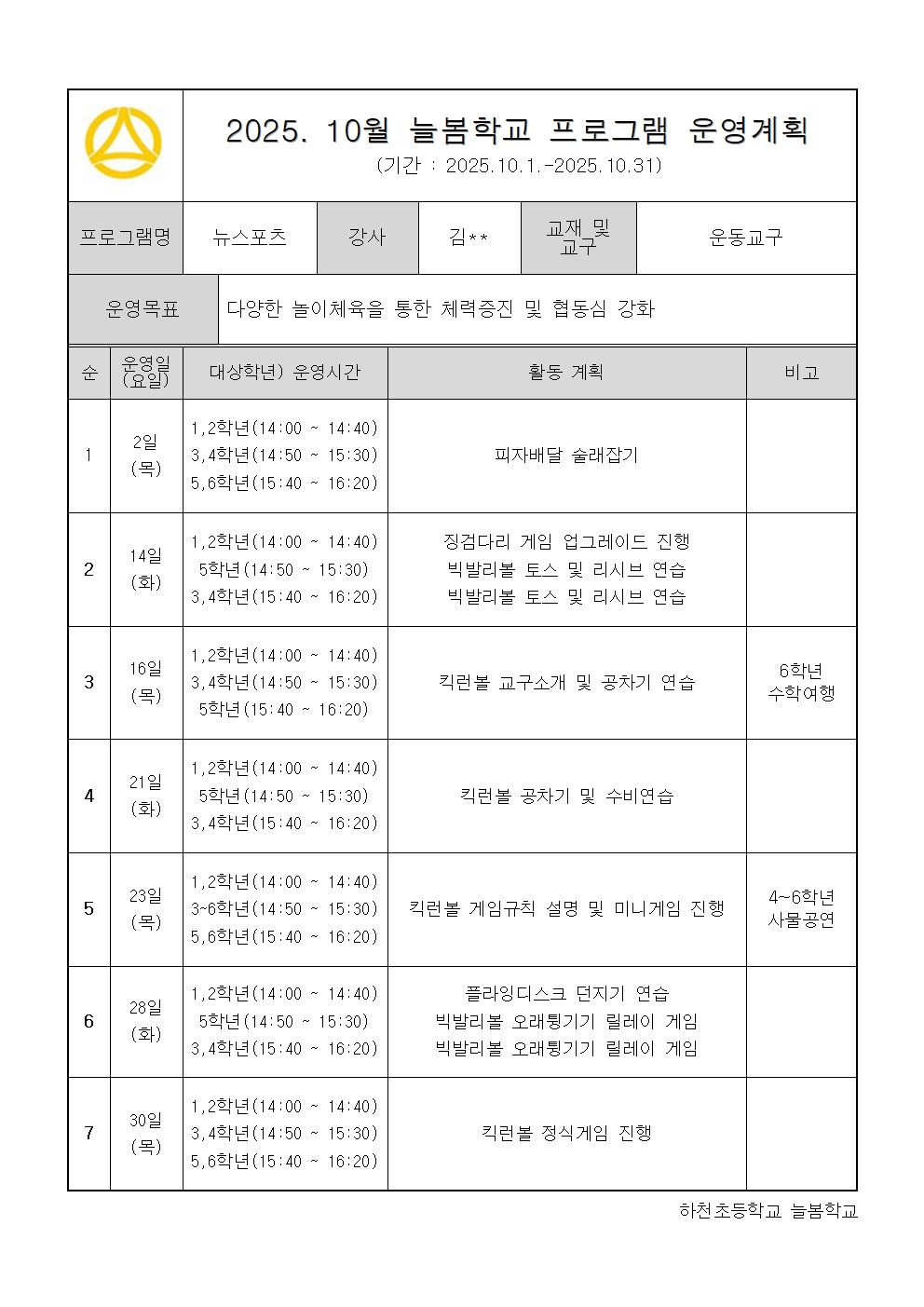 * 해당 게시물은 '돌봄·방과후학교 > 맞춤형•방과후학교 > 월별운영계획서' 게시판에서 이동되었습니다.