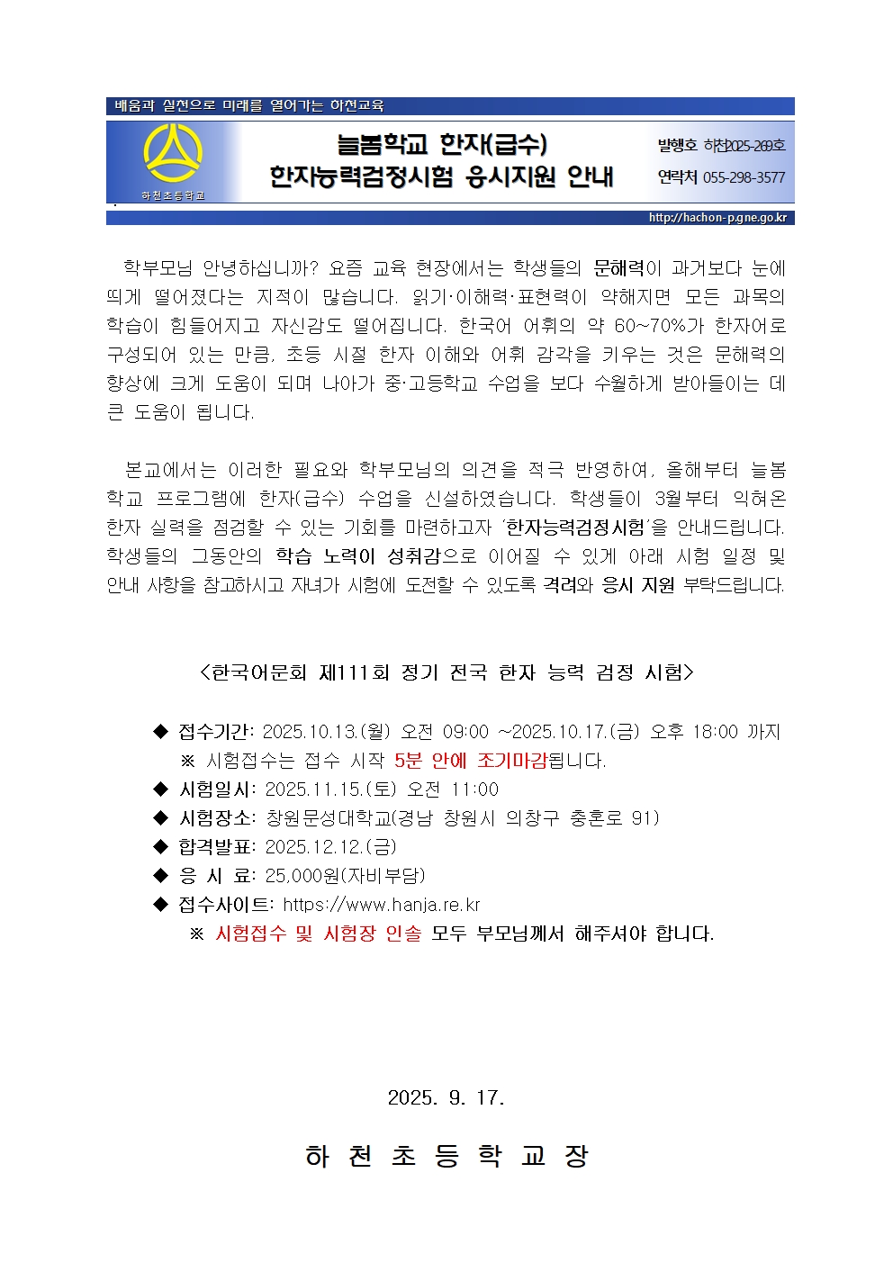 늘봄학교 한자(급수) 한자능력검정시험 응시지원 안내