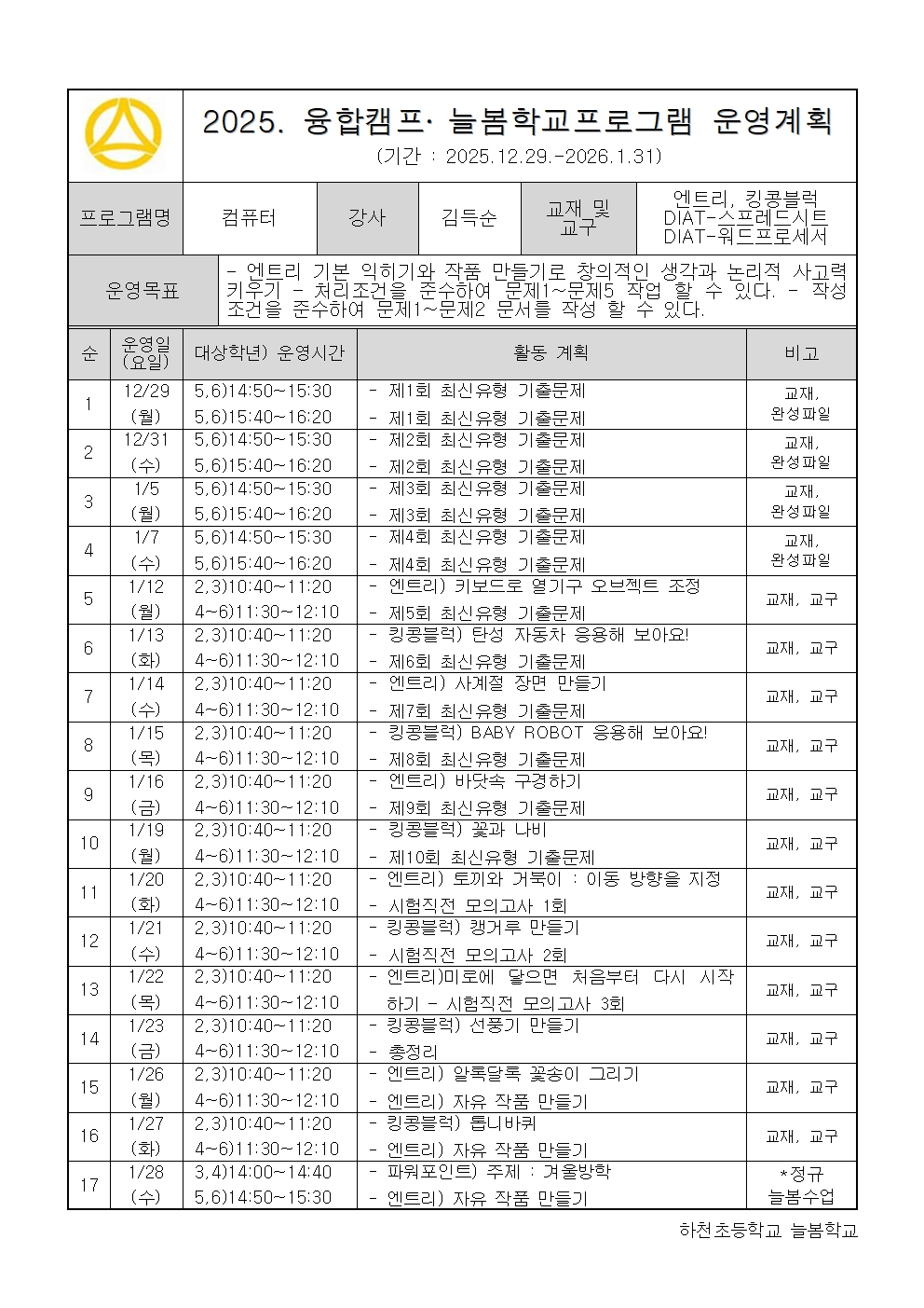 2025. 1월 운영계획(융합캠프 포함) - 컴퓨터
