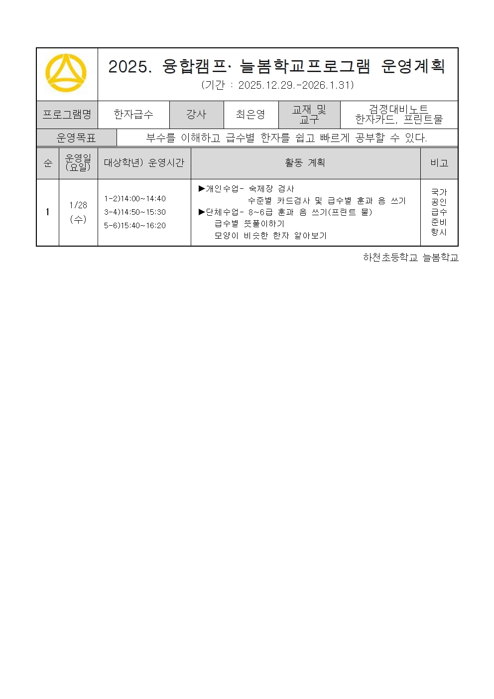 2025. 1월 운영계획(융합캠프 포함) - 한자